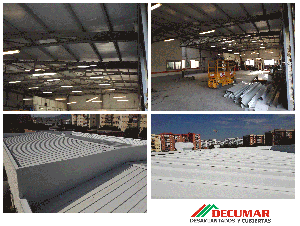 Rehabilitación de cubiertas en nave industrial de Jerez. Donde hemos sustituido la uralita (fibrocemento con amianto) por una nueva de panel tipo sándwich